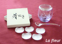 「シュガーポット」と「リング」は「ネオジュウム」という特殊な発色剤が使われていて、日光や白熱灯の下では淡い紫色に、蛍光灯の下ではブルーに変化して見えるのです。とても素敵なんです。