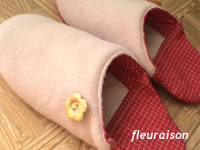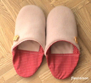 暖かなフリースを使ってバブーシュ風スリッパを作りました。 お花のウッドボタンをワンポイントに使ってちょっぴり可愛らしくしてみました。 とても暖かで履き心地も最高です。 サイズ違いで主人と娘にも作ってあげる予定。 ただ今パターンのサイズ調整中・・・。