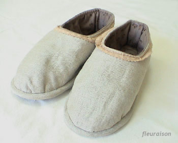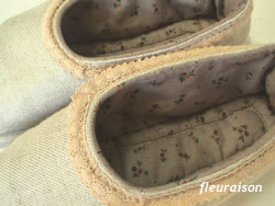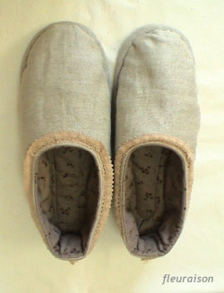 厚手のリネンとブラウンの小花柄にオーガニックレースをあしらって ルームシューズを作りました。 手持ちの靴で型紙をとってから何度か修正してようやくぴったりサイズが完成。 全体にドミット芯を2枚挟んでみたら、ふかふかでしっかりとした仕上がりになりました。