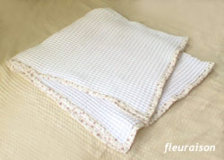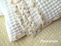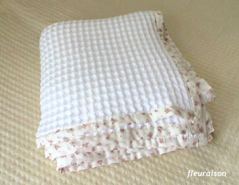 娘用にタオルワッフルのブランケットを作りました。 優しい色合いの小花柄でハイピングをして女の子らしく仕上げました。 110cm×110cmでちょっぴり大きめなのでお昼寝も夜のねんねにも大活躍です。 まだまだ残暑が続きそうなのでしばらく使えそうです。