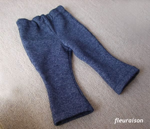 紺色の霜降りスウェットで娘のブーツカットパンツを作りました。 とっても暖かな仕上がりで娘も「あったかいね〜」と嬉しそうです。 2歳になってどんどん大きくなっていく娘のサイズ。 90cmのパターンがそろそろ小さくなってきました。