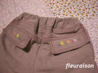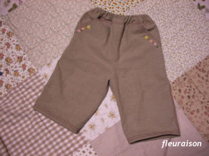 ベージュの麻デニムで娘のフラップパンツを作りました。 ステッチには20番手のレッドを使ってみました。 可愛らしく控えめな小花の刺しゅうがポイントです。 (刺しゅうは勉強中なので実家の母にしてもらいました。)