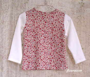 リバティ風花柄ニットで娘のTシャツを作りました。 袖にはオフホワイトのニットを使用しました。 襟部分にもオフホワイトのニットを使ってみたのですが、娘の頭が入らず失敗。 襟を花柄ニットに付け替えたらOKでした。
