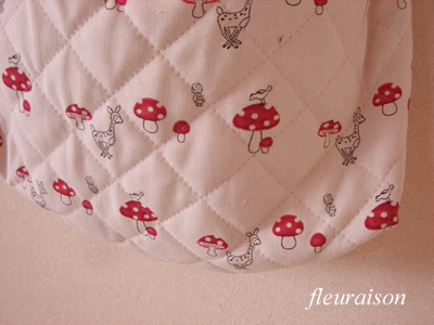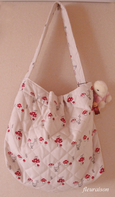 RickRackさんのShinzi katohシリーズのカラーキルト「mushroom」で、 娘の斜めがけレッスンバックを作りました。